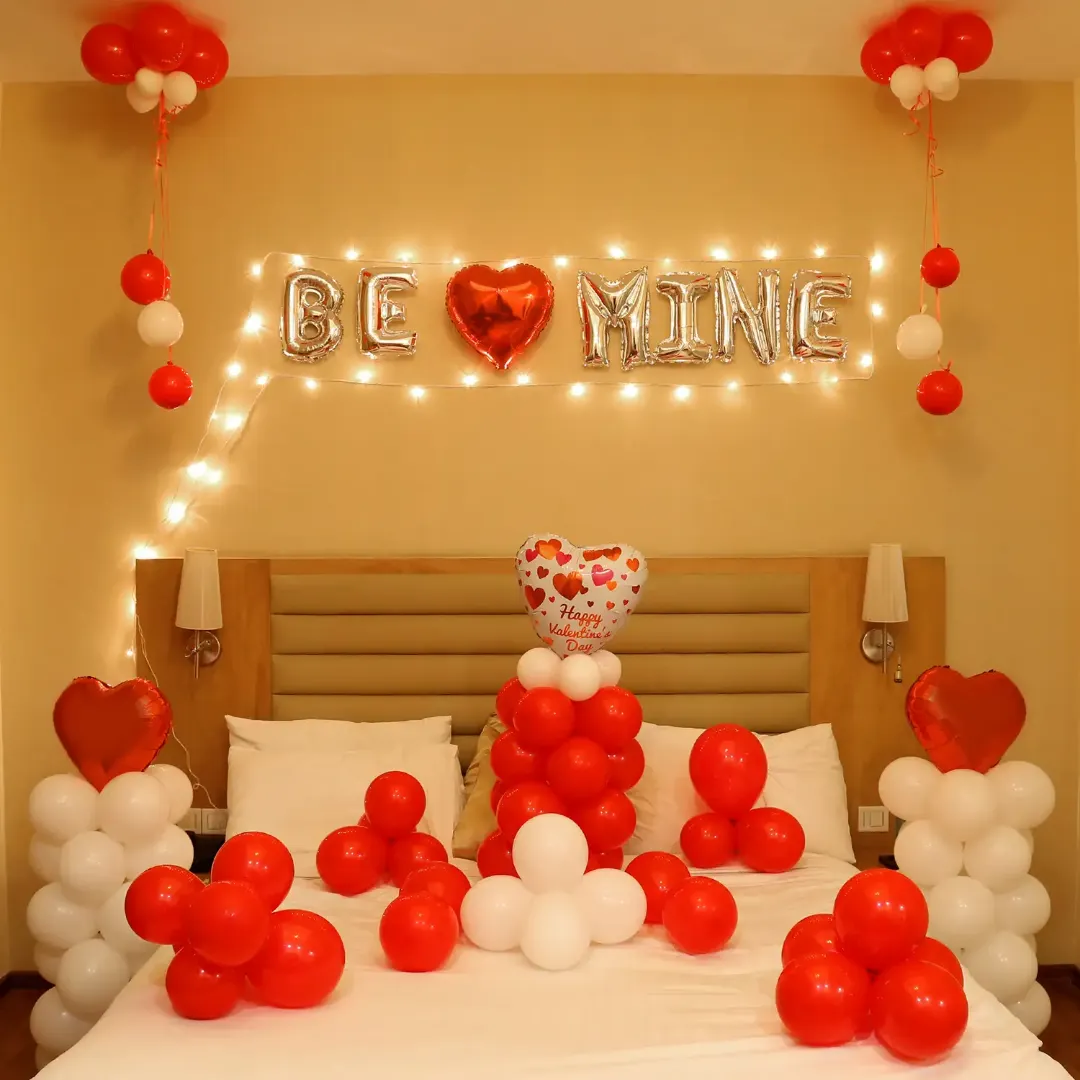 - A romantic decoration at home can easily create a classic vibe. A foil balloon spelling out BE MINE will be placed. Along with that 6 balloon bunches will be hanged on the ceiling. There will be 250 more red and white balloons. Heart-shaped balloons will also be used.
