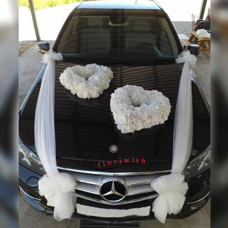 - 2 Heart Shape Decoration with White Flowers in front of the Car Bonnet