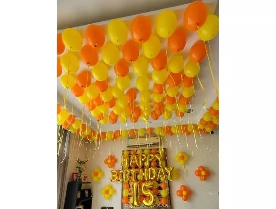 • 150 yellow and orange balloons with ribbon.40-50 on the ceiling and rest on the walls.