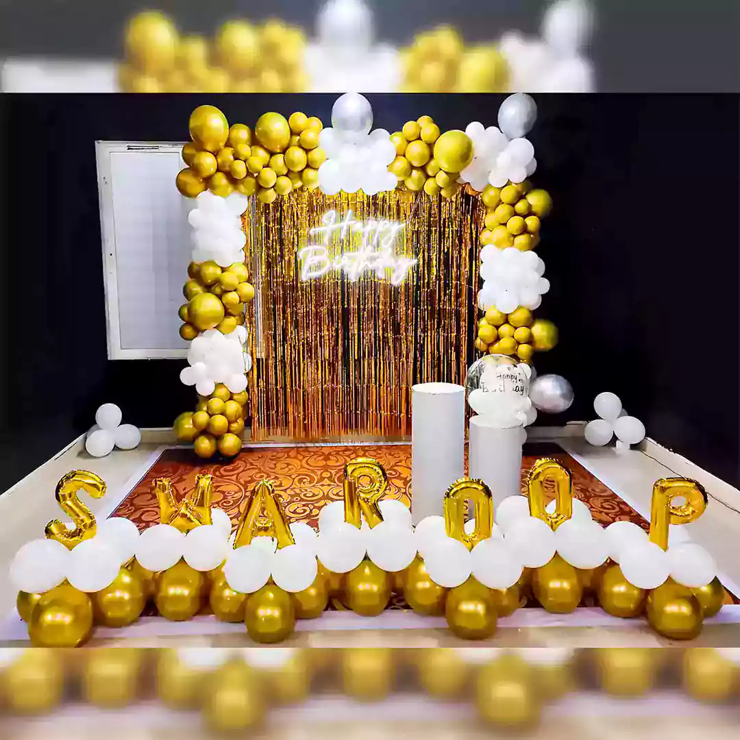 - This birthday decoration can be done at your home/hotel, whichever will be your preferred location. It has a balloon arch that has gold chrome and plain white balloon bunches. Frill curtains, a transparent boba balloon and a “happy birthday” neon signage simply enhance the look. The decor also has letter-foil balloons that read a name(can be customized). We will also include cake tables in this setup. You can easily plan a birthday surprise with our help. Simply book this golden birthday party balloon decoration online from here. This decor service is available all around Delhi & NCR.