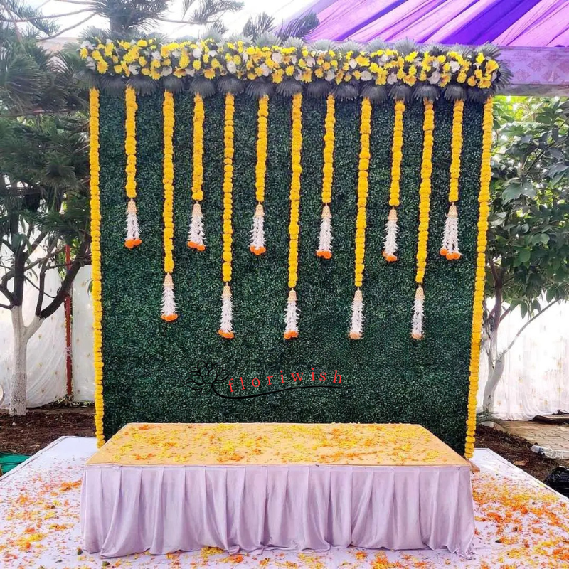 11 Small Real Flowers hanging on Backdrop made with Marigold and Rajnigandha