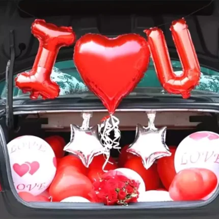 - We will decorate your car’s trunk with golden “HBD” letter foil balloons, red heart-shaped foil balloons, fairy lights, heart strings and personalized numeric foil balloons. The setup also includes a personalized photos stash and loose balloons.
