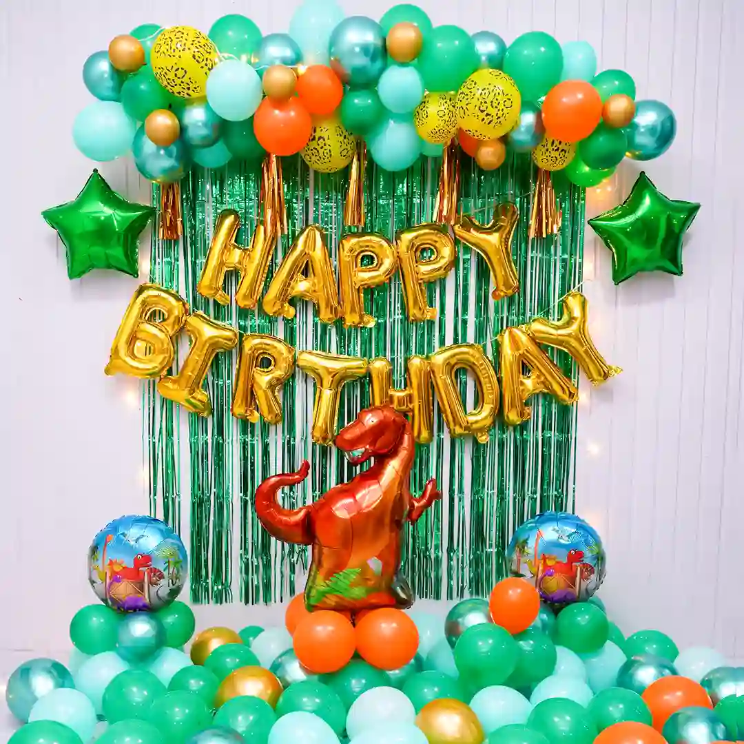 • Set against a green backdrop, the scene is adorned with frill curtains, twinkling fairy lights, and “Happy Birthday” letter foil balloons, casting a magical glow. A magnificent balloon arch, designed from an array of green balloons, takes everyone to the land of adventures. Golden confetti balloons, star-shaped foil balloons, and whimsical dinosaur-themed balloons add a dash of excitement, while golden tassels sway gently. Below, the floor is alive with the rustle of loose balloons, inviting little ones to play. Whether celebrating a birthday boy or girl, this enchanting decor promises thrills for all. Capture cherished moments against this captivating backdrop on this special day. You can easily book this dinosaur birthday theme decor online from here. We provide this balloon decor service everywhere in Delhi & NCR.