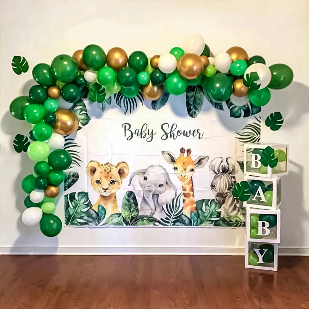 • For this backdrop, we have used a forest and animal-printed flex board. Along with it, there is a balloon arch that has green, white and gold balloons which match the theme.