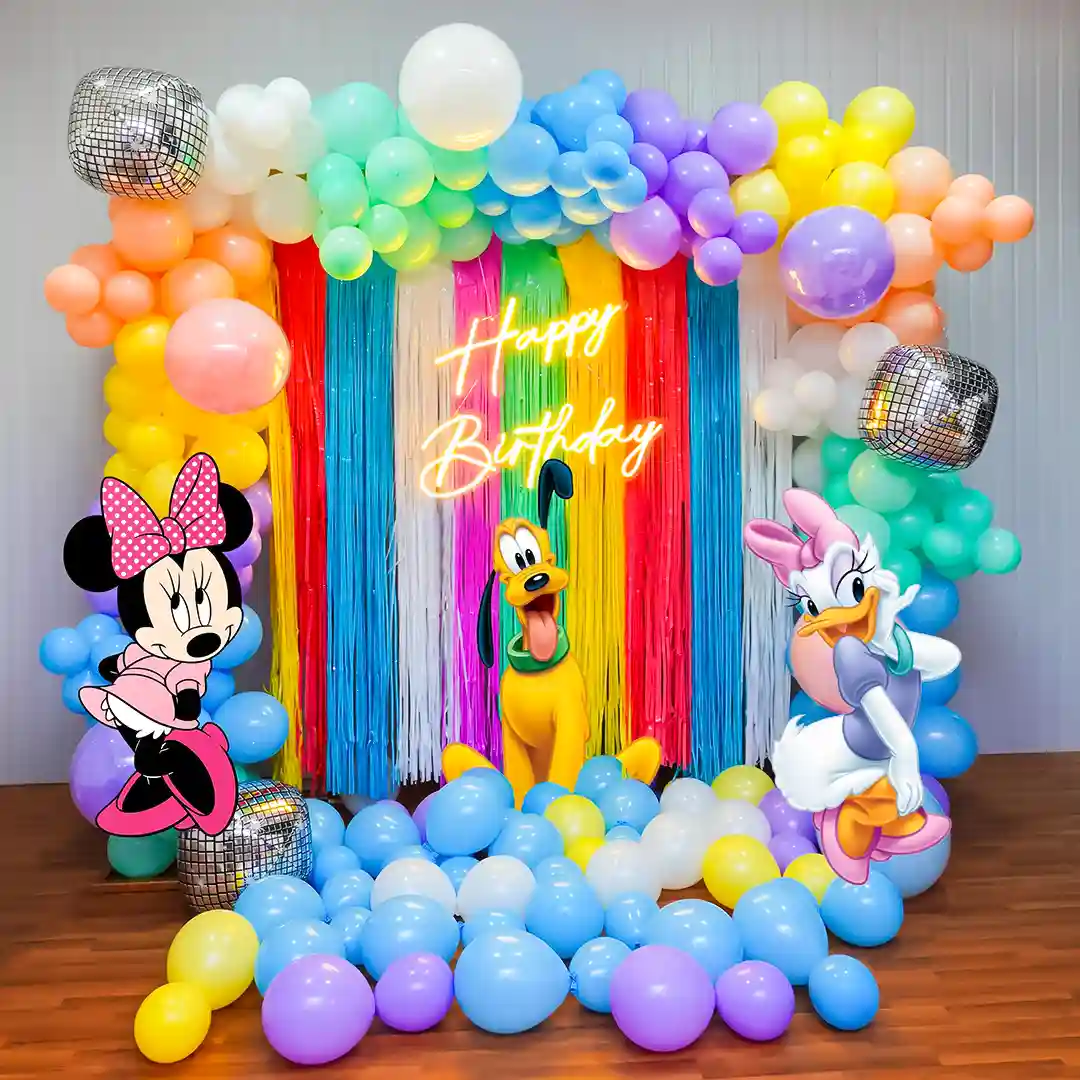 - Plan a cheerful birthday party for your baby girl with this decor theme. The decor features a lively backdrop adorned with frill curtains in hues of white, blue, orange, pink, green, peach, and yellow, creating a kaleidoscope of colours. Adding to the festive ambiance, a “Happy Birthday” neon signage adds a touch of excitement. Completing the setup is a vibrant balloon arch in the same colour theme. To infuse some fun into the decor, we’ve incorporated Minnie Mouse themed cutouts. Ideal for birthday parties held at home or in a hotel banquet hall, this Minnie Mouse inspired decor promises to make the celebration a joyful experience for everyone.
