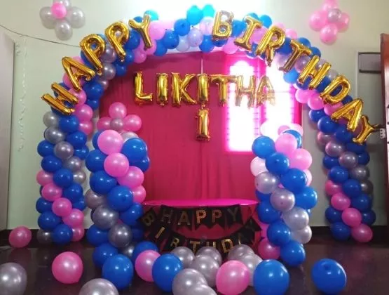 - 1 Balloon arch Blue/Pink/Silver color as backdrop with Happy Bday foil balloon on it
