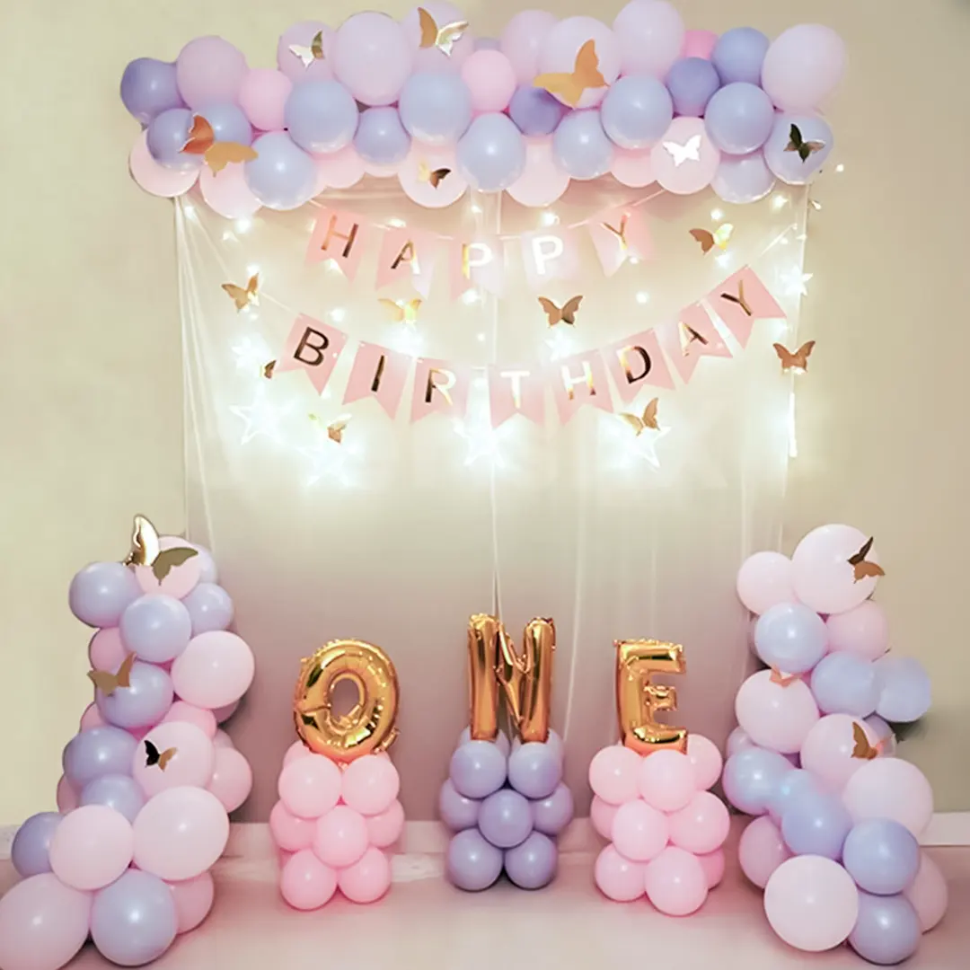 • At the heart of the décor is a stunning balloon arch, adorned with pastel pink and purple balloons. Matching balloon pillars on the ground complement the theme, while gleaming letter foil balloons beautifully read “One” above them. The backdrop has delicate white net curtains with twinkling star LED lights. A charming “Happy Birthday” banner in soft pink adds a touch of sweetness. To complete the enchantment, the entire setup is adorned with graceful rose gold butterflies. Plan an adorable birthday surprise for your baby girl with it.