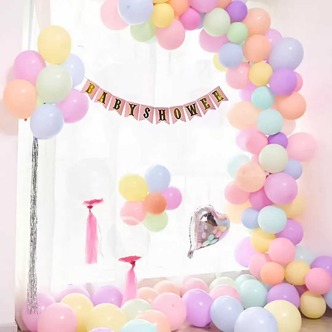 - The decor features a colourful balloon arch designed using pastel balloons in yellow, purple, pink, peach and blue colour. Paired with a “Baby Shower” bunting, this setup looks simple and beautiful. It’s a perfect decor idea for surprising the mom-to-be at home/hotel room. Simply book this colourful pastel baby shower decoration online from here. We provide this balloon decor service all around Delhi & NCR.