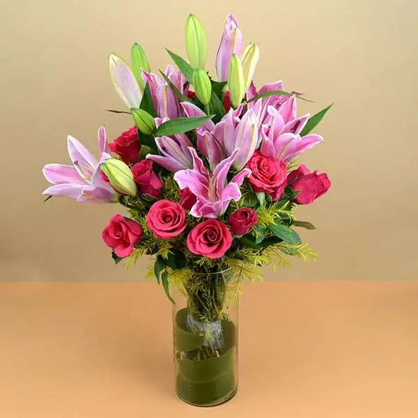 Pink Oriental Lilies n Roses Bunch
