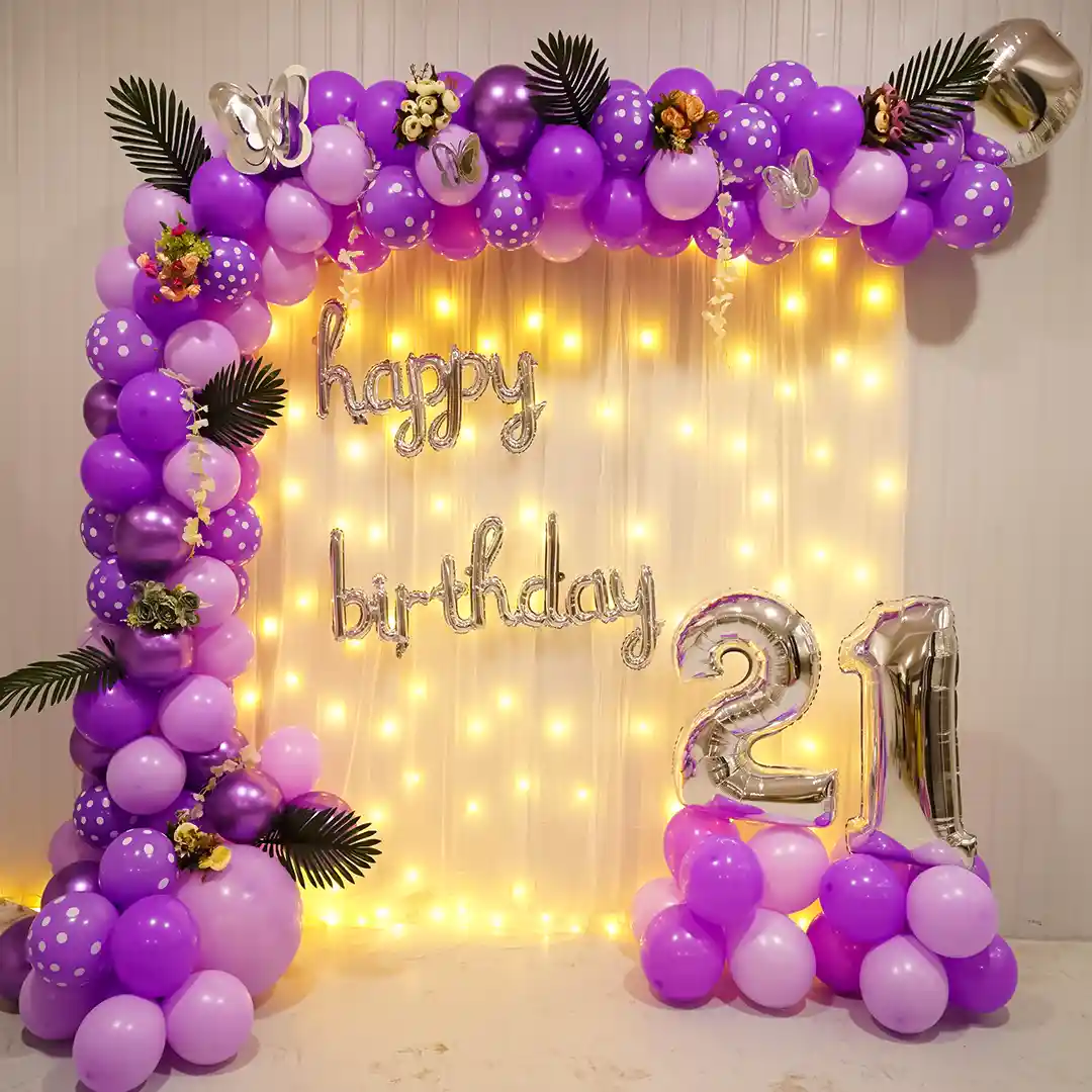 - The decor theme features a gorgeous balloon arch in purple colour. This setup is adorned with net curtains, fairy lights and “Happy Birthday” cursive foil balloons. We have also used orchid flower strings, artificial palm leaves and floral bunches to beautify the look. The setup includes numeric foil balloons that can be customized. Choose this decor theme for your wife/girlfriend/mother/daughter’s birthday party. Simply book this purple birthday decoration online from here. We provide this balloon decor service all around Delhi & NCR.