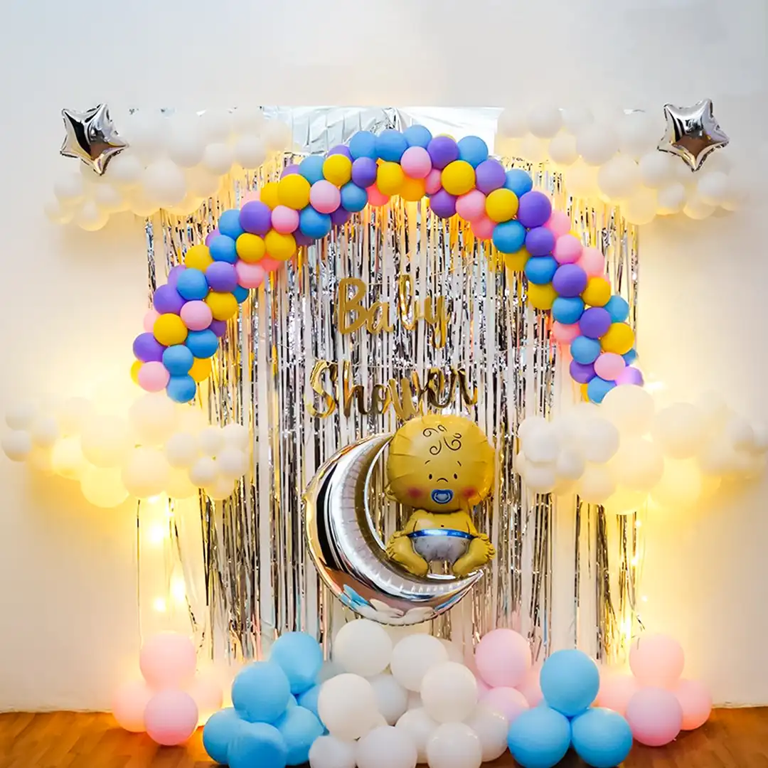 - The decor comes with frill curtains and a “Baby Shower” bunting. It is adorned with a colourful balloon arch just like a rainbow with clouds below it in white. We have also used fairy lights, baby shaped foil balloons and a moon shaped foil balloon to beautify the look. Simply book this rainbow and clouds baby shower decor online from here. We will decorate your location anywhere in Delhi & NCR.