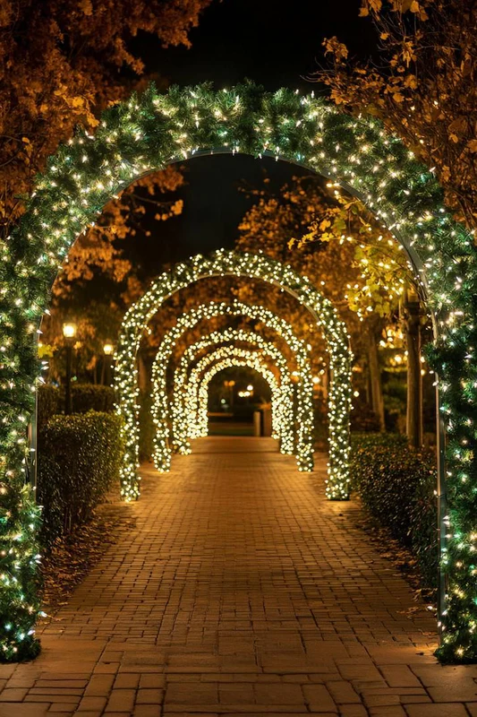 Elegant Outdoor Lighted Archway with Draped Curtains
