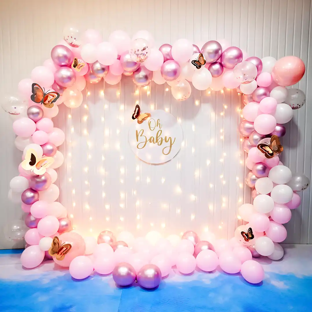 - A magnificent balloon arch stands, showcasing a delightful blend of pastel pink, pristine white, and sparkling rose gold confetti balloons. Graceful rose gold butterflies flutter amidst the balloons, adding a touch of whimsy and magic to the scene. The backdrop comes alive with the soft glow of fairy lights, casting a warm and inviting ambience throughout the room. At its centre, an elegant “Oh Baby” cutout steals the spotlight, serving as a gentle reminder of the precious miracle soon to grace the lives.