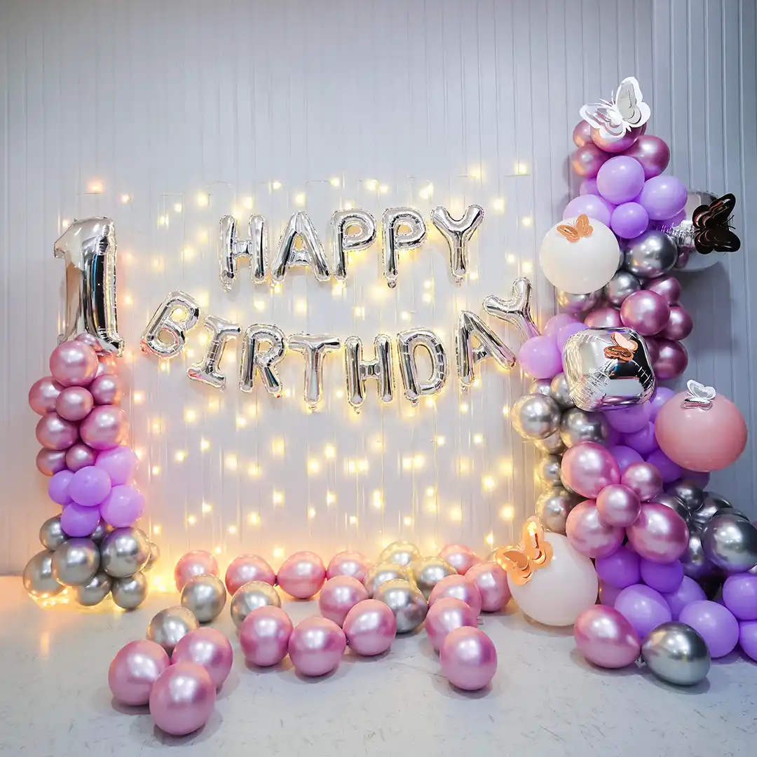 • We have adorned the backdrop wall with fairy lights and “Happy Birthday” letter foil balloons. A beautifully crafted balloon arch surrounds it. This arch has a delightful blend of pink, purple and silver coloured balloons. This captivating arch is then decorated with delicate silver and rose gold butterflies, eye-catching 4D silver-coloured balloons and big-sized balloons. The setup is completed with a customizable numeric foil balloon, adding a personal touch to your special day. The floor around is covered with loose balloons. Plan a beautiful birthday surprise for your wife/girlfriend/sister/mom with this decor idea.