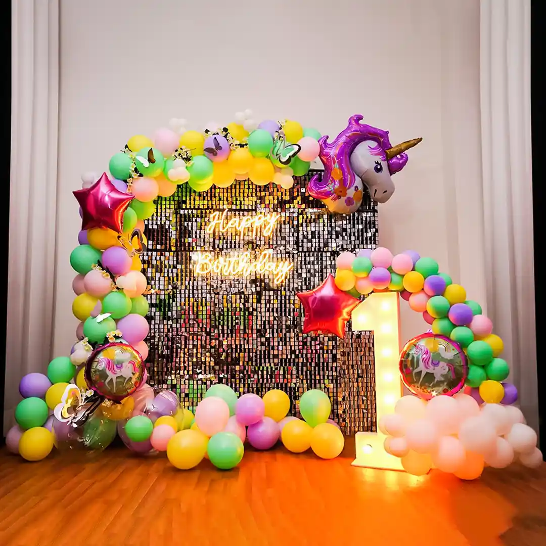 - Picture a shimmering silver sequin wall backdrop adorned with a colourful balloon arch. Illuminating the scene is a “Happy Birthday” neon signage, casting a warm glow. To infuse the setup with a touch of mystical charm, we’ve adorned the arch with unicorn-themed foil balloons. Standing beside the backdrop is a customized numeric LED light marquee surrounded by colourful balloons. The floor around is covered with loose balloons, completing the magical atmosphere. Whether it’s a grand celebration at a hotel banquet, a cosy gathering at home, or an outdoor party on a lawn or terrace, this magical decor theme will make your celebrations more special. Simply book this shimmering sequin unicorn theme decoration online from here. We provide this balloon decor service everywhere in Delhi & NCR.