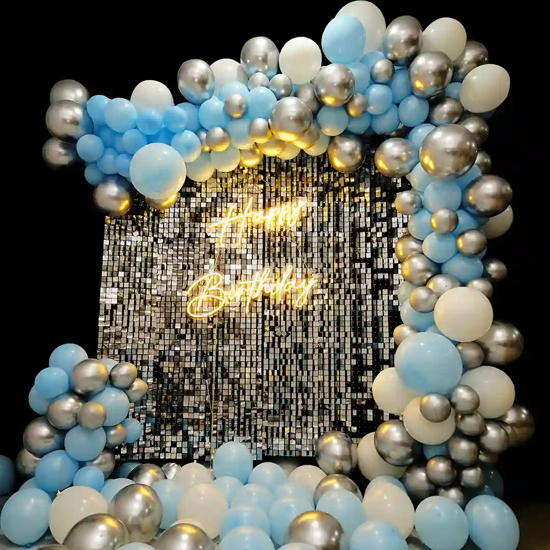 - Picture a silver sequin wall backdrop, adorned with radiant “Happy Birthday” neon lights at its heart. To add a touch of whimsy, a balloon arch, featuring a blend of silver chrome, sky blue, and white balloons, sets the scene beautifully. Completing the look, we have scattered loose balloons on the floor. This decor theme is ideal for grand birthday celebrations, whether on a terrace, in a lobby, a lawn, or a hotel banquet area. This setup is perfect for celebrating milestone birthdays like the 25th, 30th, 40th, 50th, and beyond.
