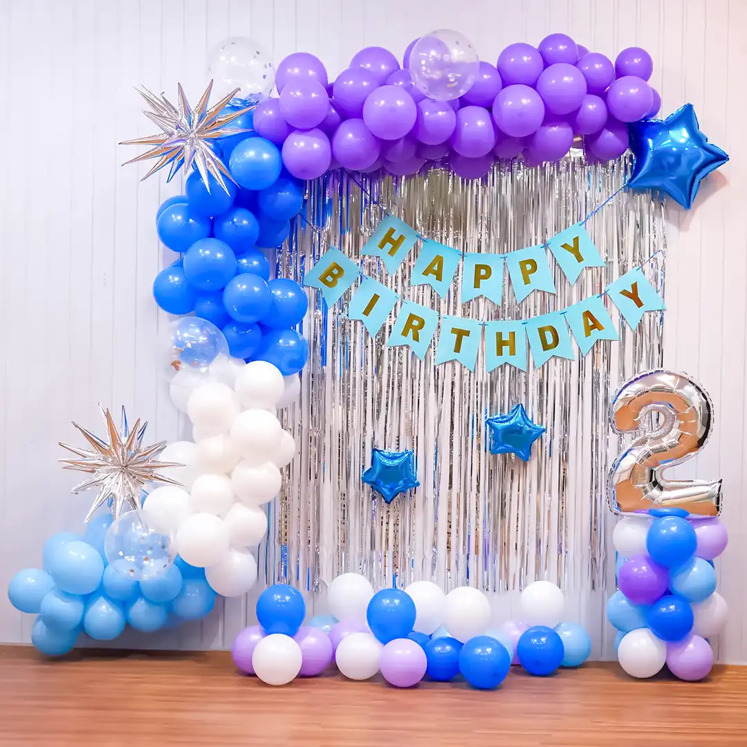 • The idea is to decorate the place in blue, purple and silver colour. We will design a balloon arch that will be adorned with confetti balloons and frill curtains. The setup also includes a “Happy Birthday” bunting, blue coloured stars, silver coloured stars and a customized numeric foil balloon. This is perfect decor theme for your son/brother/dad/husband/boyfriend’s birthday.
