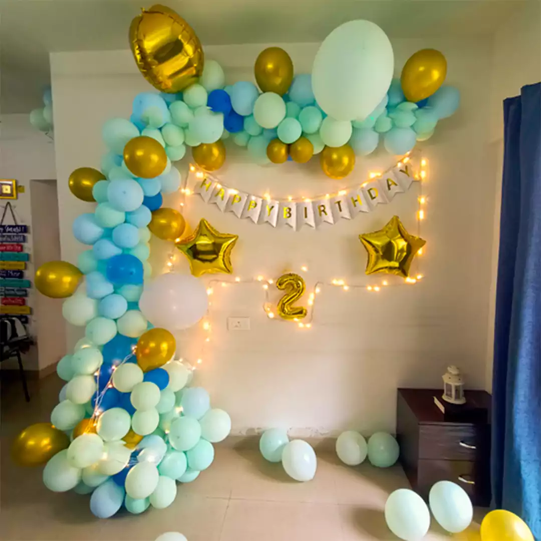 • The setup includes a balloon arch made using sky-blue balloon bunches. It is then highlighted with a 3D star foil balloon and fairy lights. The decor also includes plain golden star-shaped foil balloons that enhance the look. Take whimsical party photos with this decor idea. You just have to book this sky-themed party decoration online from here. We provide this balloon decor service everywhere in India.