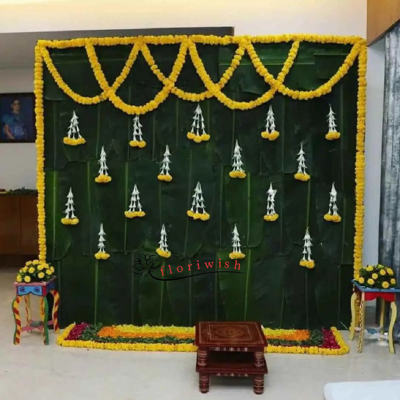 18 Small Real Flowers hanging on Backdrop made with Marigold and Rajnigandha