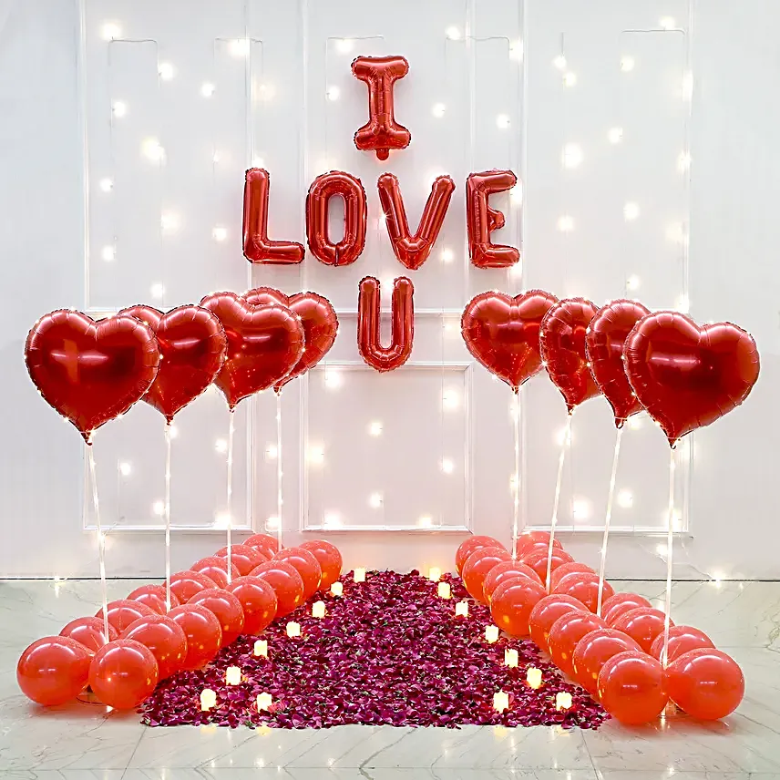 Transform Valentines Day into an unforgettable celebration with this enchanting setup. A romantic pathway of rose petals and twinkling tea lights lead the way, while vibrant balloon bouquets and glowing LED accents create a mesmerising ambiance. The I Love You foil balloons add a heartfelt touch, making this the perfect gift to sweep your partner off their feet and surround them with love, magic, and warmth.