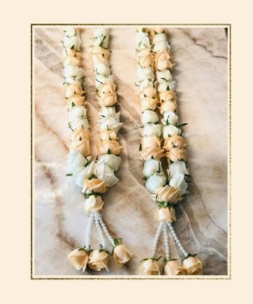 Our White & Peach Rose varmala Intertwined with these are the peach roses, radiating a gentle warmth and a touch of romance. Adding a delightful gradient of color that evokes feelings of tenderness and affection. The peach tones bring a playful yet sophisticated charm to the Varmala.