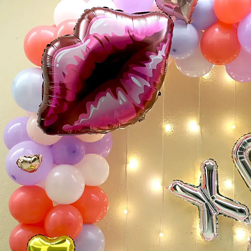 Step into a dreamscape of pastel hues and romantic elegance with this stunning balloon arrangement. A whimsical arch of delicate pinks, purples, and blues creates a captivating backdrop, adorned with shimmering golden and rose-gold hearts. Scattered balloons and glistening XOXO accents breathe playful charm into the ambiance, while soft LED lighting casts a magical glow. The perfect Valentines surprise to express your love in a setting straight from a fairytale.
